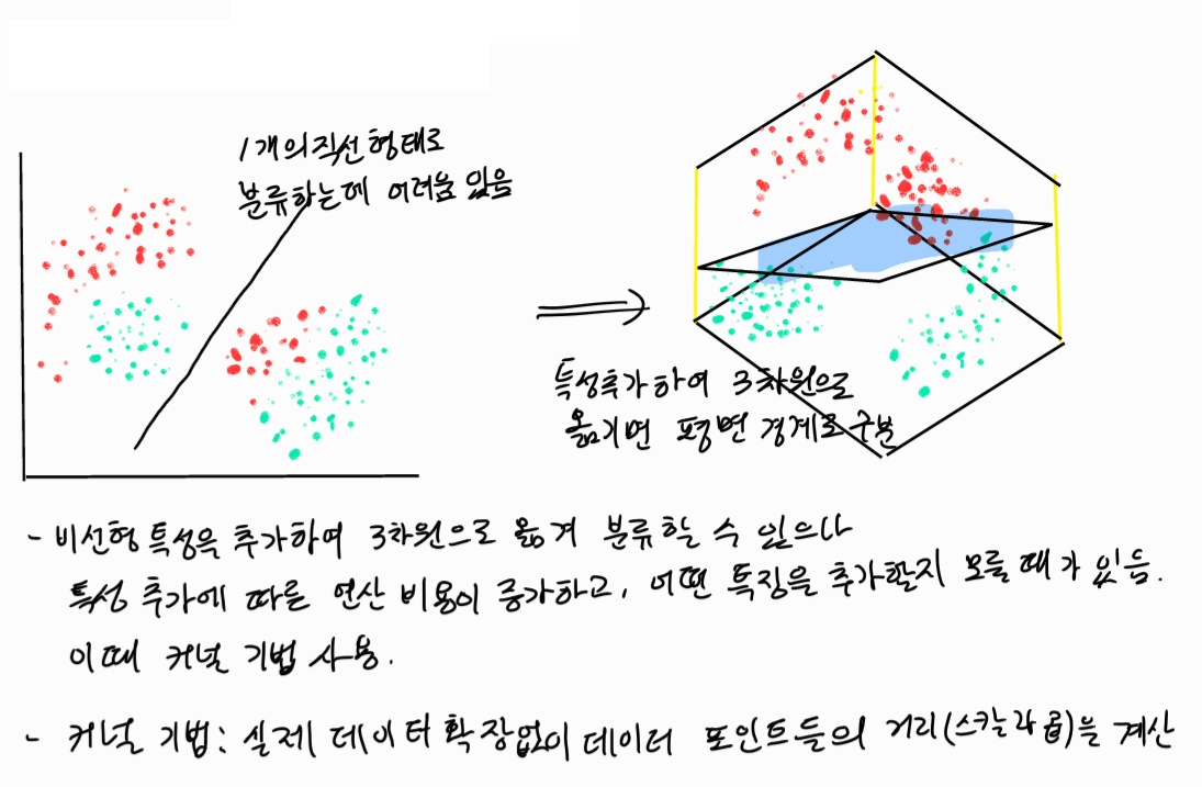 커널 기법의 기본적인 아이디어는 데이터를 높은 차원으로 이동시켜 고차원 공간에서 데이터를 분류하고자 함이다.