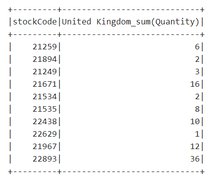 pivoted.select("stockCode","`United Kingdom_sum(Quantity)`").show(10)