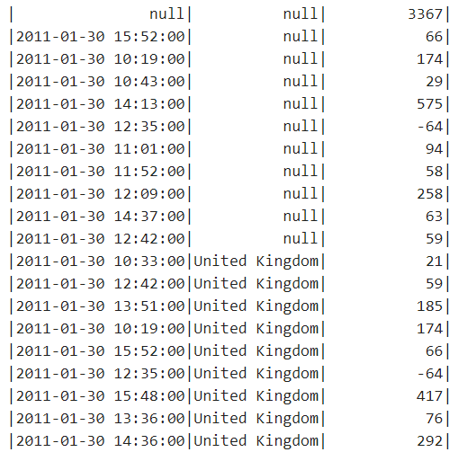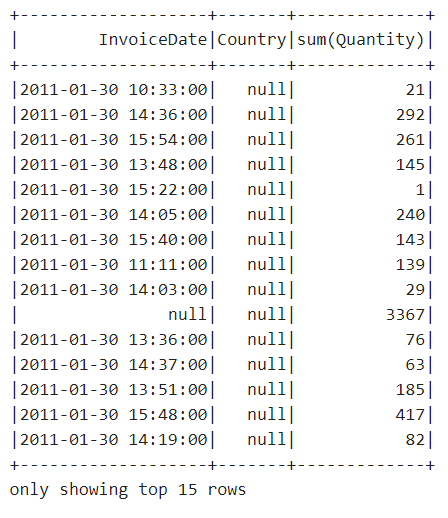 val rollUpRetail=retailNotNull.rollup("InvoiceDate","Country").agg(sum("Quantity"))