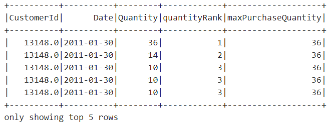 val maxPurchaseQuantity=max(col("Quantity")).over(windowSpec)