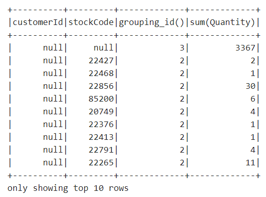 .agg(grouping_id(),sum("Quantity"))