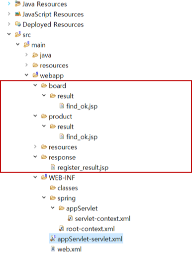 아래와 같이 view 페이지가 서로 다른 폴더에 저장된 경우 view 페이지마다 다른 경로를 지정해야한다. 이를 위해 BeanNameViewResolver가 필요하다.