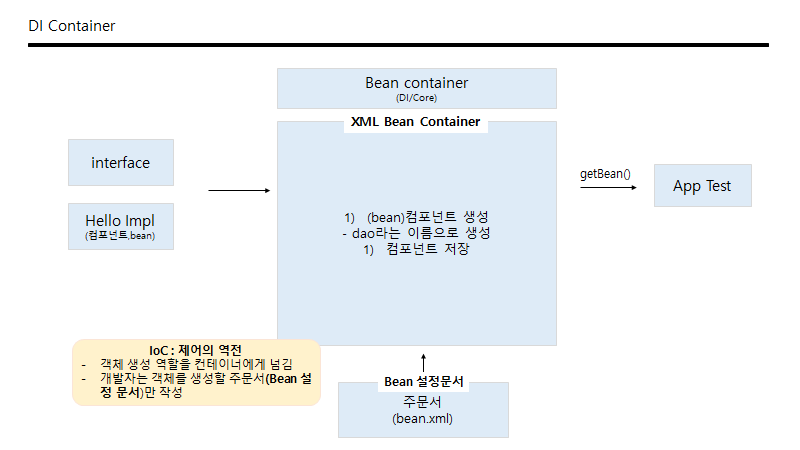 - 컨테이너가 객체 생성을 하도록 넘기고, 코드로 객체 생성하지 않는다.