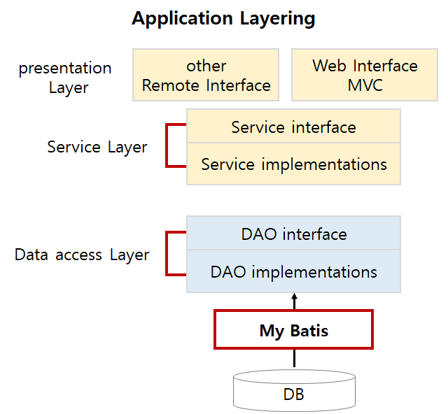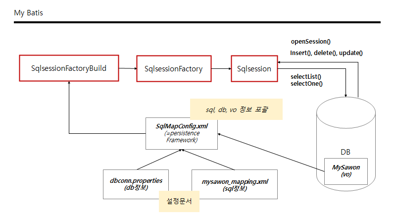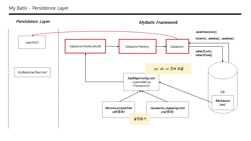 - interface인 DAO가 session을 hasing하여 Persistence Layer와 MyBatis Framework를 연결