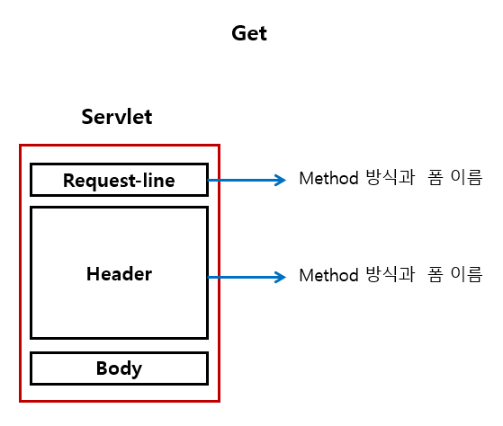 - get 방식일 때 servlet의 1) request line 2) header 3) body 는 아래와 같이 구성됨.